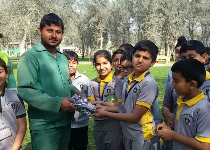 In order to harmonize with the motto of the year 2017 as the ‘Year of Giving’, a small venture was initiated by the students of classes IV and V as part of their picnic to Saqr Park on 7th and 8th February respectively. It was a humanitarian step put forward by the children to give something to the workers in the Park. As they work in the severe cold outside it was a good decision to give some blankets, woolen caps, mufflers, gloves, socks etc. The fund for the same was collected by the students as per their wish. All the students participated with much enthusiasm and the amount was enough to purchase the required items.